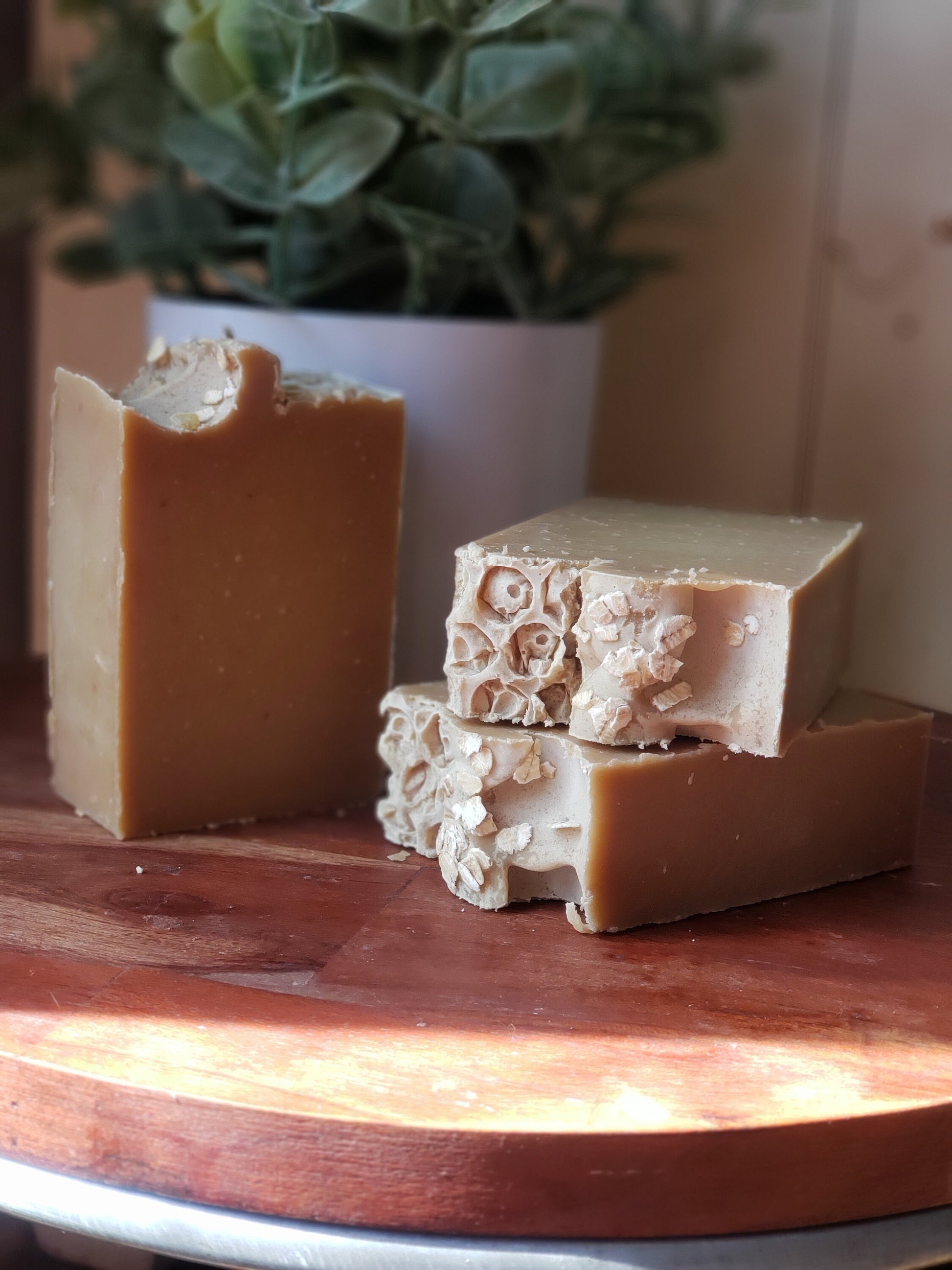Scented with Oatmeal, Milk, and Honey fragrance oil, this bar smells amazing! Since being released as our first soap available for sale, it has remained the favorite!